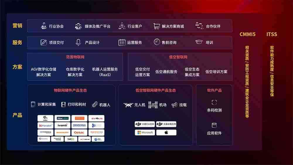 聚合国内外先进的物联网硬件产品品牌,,,聚焦数字化仓储、、、机器人运营、、、低空智联网等领域,,,共同打造适合客户业务场景的解决方案并提供交付服务
